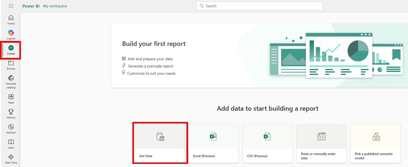 U kunt nieuwe semantische importmodellen in de service maken door Gegevens ophalen te selecteren op de pagina Maken .