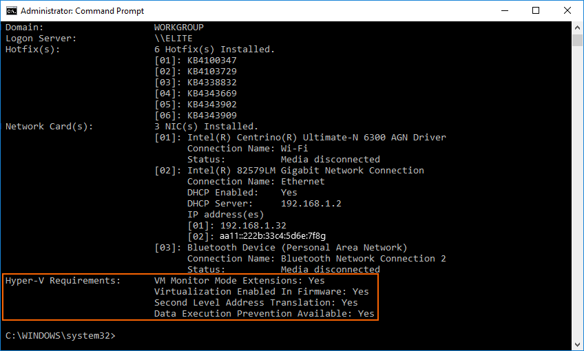 If all listed Hyper-V requirements have a value of Yes, then your computer can support Hyper-V. For example: