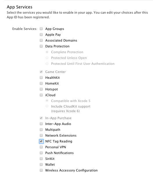 Create a new App ID and ensure that the NFC Tag Reading service is ticked: