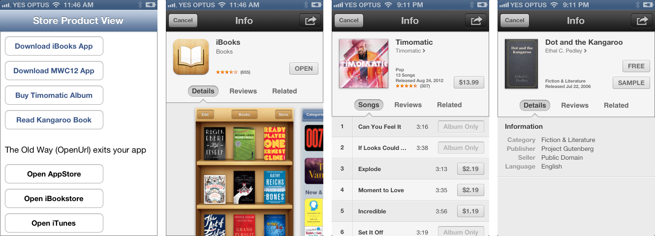 - In-App Content Display & Aankoop: gebruikers kunnen apps, muziek, boeken en andere iTunes-inhoud kopen en downloaden zonder uw app te verlaten. U kunt ook een koppeling maken naar uw eigen apps om het stimuleren van aankopen of beoordelingen en waarderingen aan te moedigen.