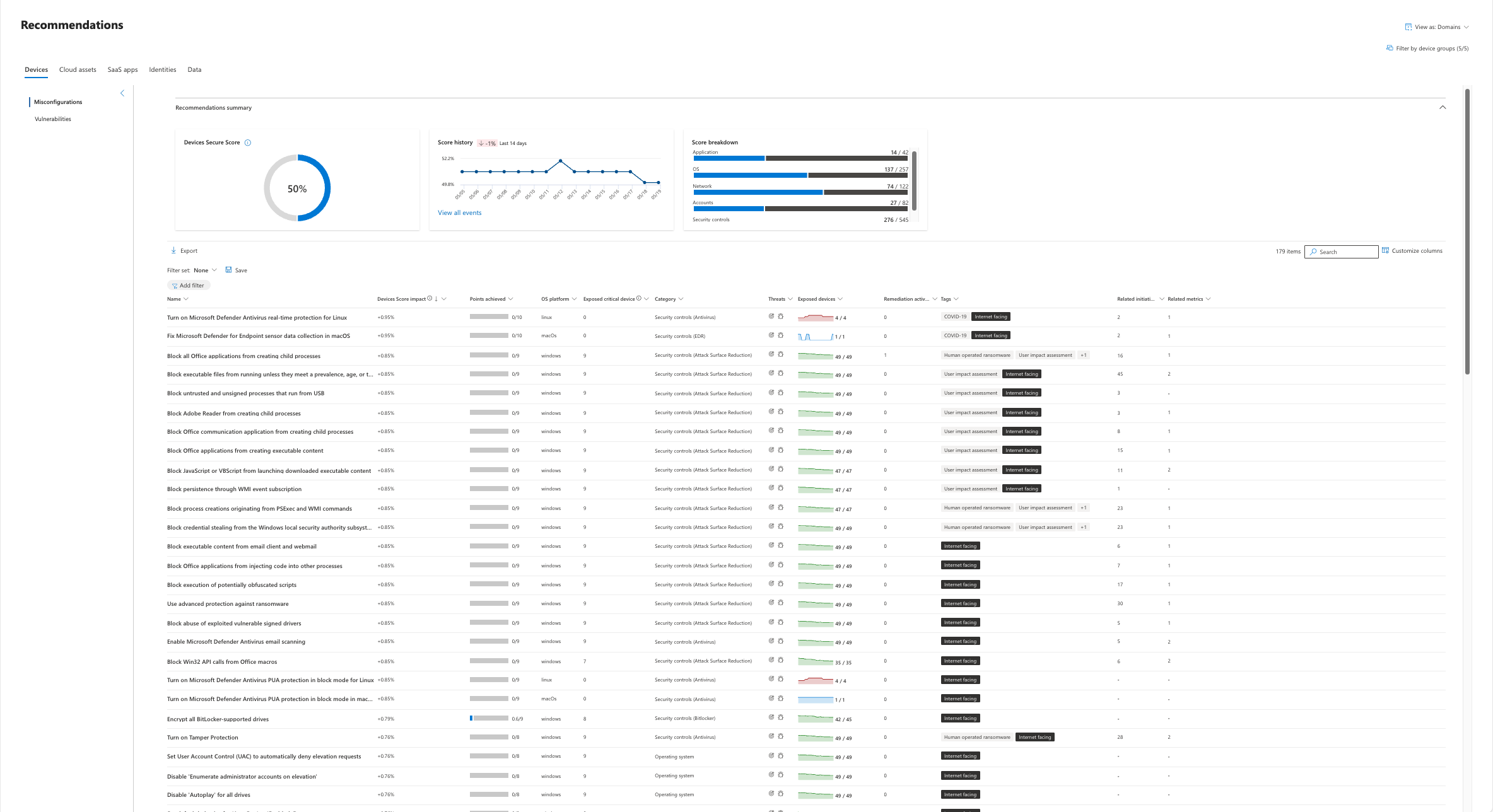 - Apparaten : apparaatgerelateerde aanbevelingen, waaronder onjuiste configuraties en beveiligingsproblemen