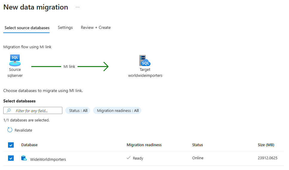 Controleer op het tabblad Controleren en maken de instellingen en controleer op waarschuwingen. Het is mogelijk om de migratie te starten met enkele waarschuwingen, maar niet met andere. Selecteer Gegevensmigratie starten om uw gegevens te migreren naar uw SQL Managed Instance-doel.