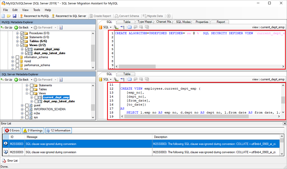 Tijdens de conversie worden uitvoerberichten van SSMA voor MySQL weergegeven in het uitvoervenster en foutberichten in het paneel Foutenlijst. Gebruik de uitvoer- en foutgegevens om te bepalen of u uw MySQL-databases of het conversieproces moet wijzigen om de gewenste conversieresultaten te verkrijgen.