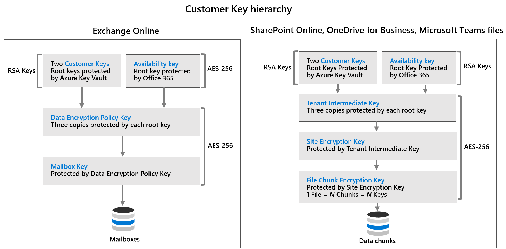 Customer Key allows customers to use their own root keys to encrypt their data. Customer keys are uploaded to or generated within Azure Key Vault, allowing customers to control the ability of Microsoft services to decrypt and process customer data. This option is currently available for Exchange Online, SharePoint Online, and OneDrive for Business.
