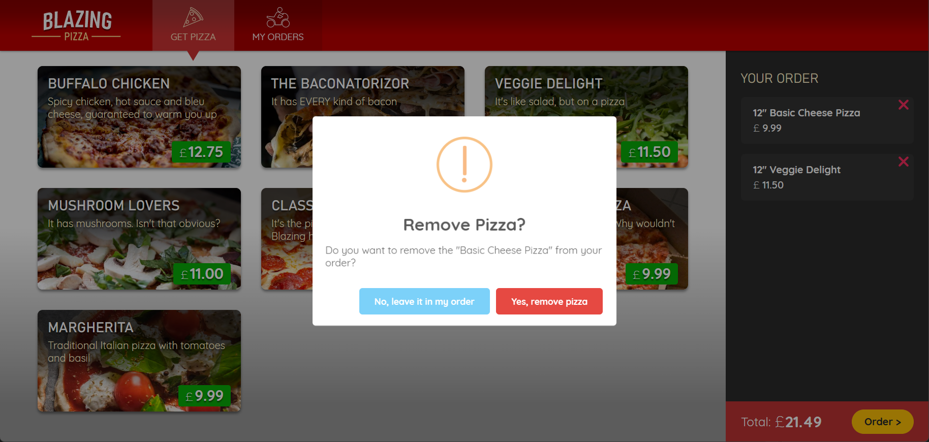 Nadat een klant een pizza aan zijn bestelling heeft toegevoegd, kan hij een X pictogram selecteren om de pizza zonder bevestiging uit de bestelling te verwijderen. Om te voorkomen dat klanten per ongeluk pizza's uit hun bestellingen verwijderen, wil het pizzabedrijf dat u een bevestigingsprompt voor het verwijderen van items toevoegt.