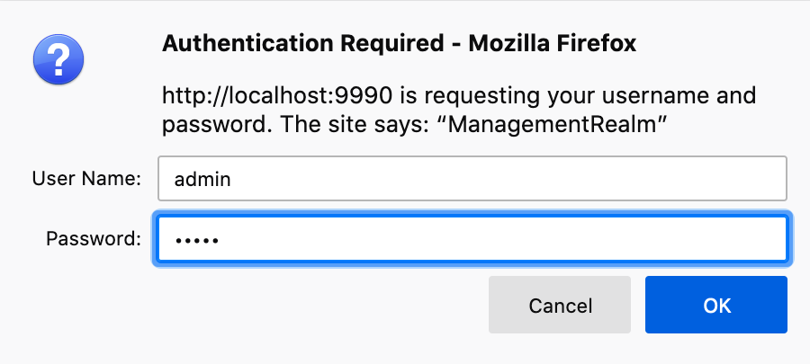 http://127.0.0.1:9990/console.Meld u in het dialoogvenster Verificatie aan met de eerder gemaakte gebruikersnaam en het wachtwoord.
