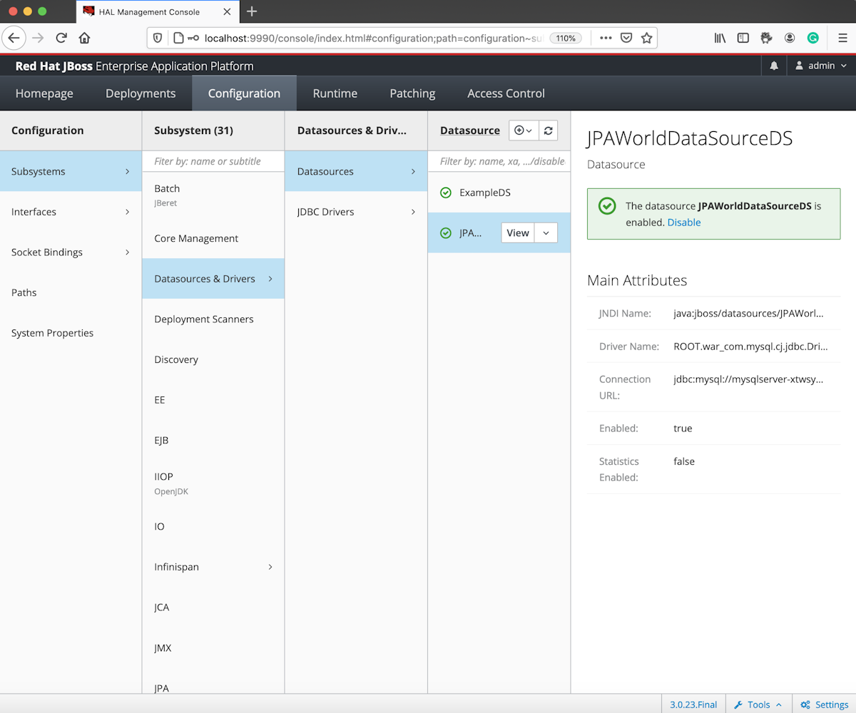 /subsystem=datasources/data-source="JPAWorldDataSourceDS":test-connection-in-poolDe volgende uitvoer is gebruikelijk: