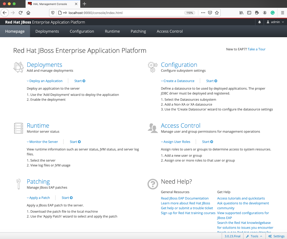 Picked up JAVA_TOOL_OPTIONS: -Xmx5480M -Djava.net.preferIPv4Stack=true Updated user 'admin' to file '/opt/eap/standalone/configuration/mgmt-users.properties' Updated user 'admin' to file '/opt/eap/domain/configuration/mgmt-users.properties'Open de webconsole vanuit een webbrowser in uw lokale omgeving met behulp van