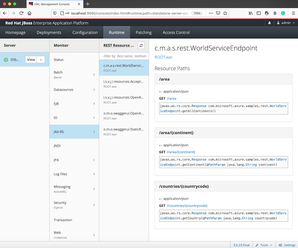 Configuratie Subsystemen Gegevensbronnen & Stuurprogramma's Gegevensbronnen te selecteren.U kunt ook de RESTful-eindpunten van uw toepassing bevestigen door Runtime><uw systeem>>JAX-RS><uw toepassing> te selecteren.