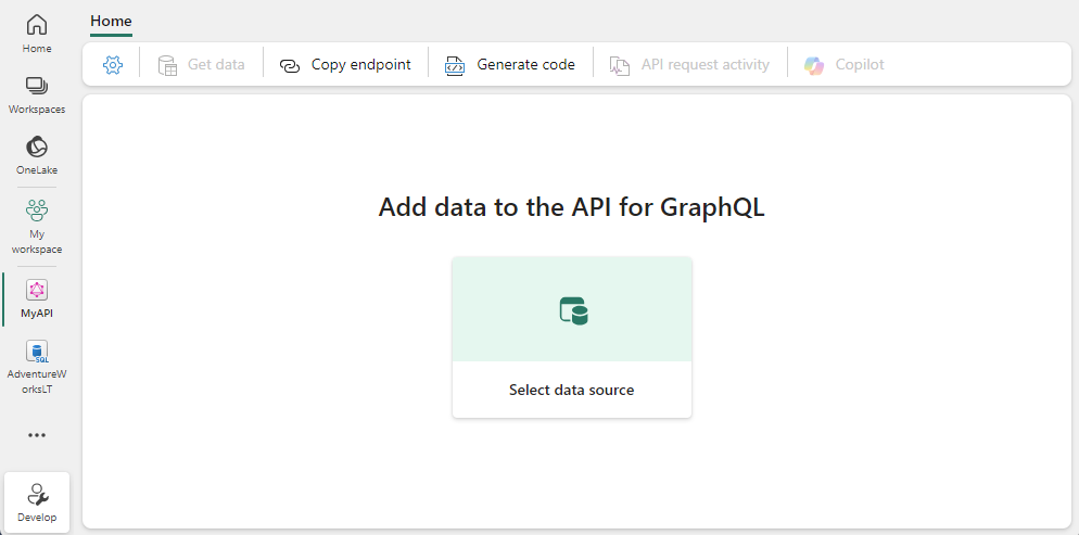 Als u een volledig functionele API wilt maken voor toegang tot uw gegevens in Fabric, begint u vanuit elke werkruimte en selecteert u Nieuw item. Selecteer API voor GraphQL in het deelvenster dat wordt geopend onder Gegevens ontwikkelen.