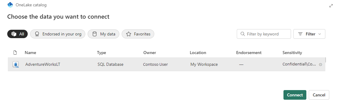 Maak vervolgens verbinding met een gegevensbron door gegevensbron selecteren te selecteren. Kies in het dialoogvenster Connectiviteitsoptie kiezen tussen eenmalige aanmelding (SSO) of opgeslagen referenties. Selecteer vervolgens de gegevens waarmee u verbinding wilt maken.