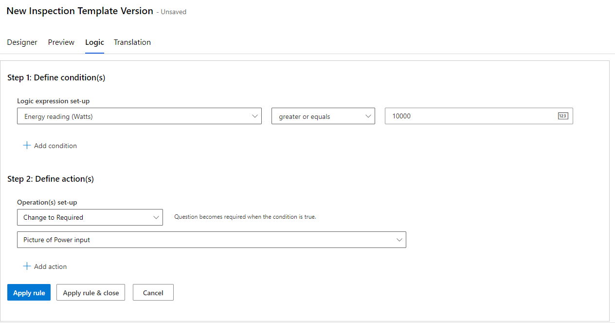 The Logic tab on the inspection form allows you to add rules to control the flow of questions in the inspection.