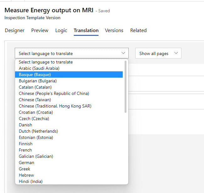 You can add language variations for each inspection. In an inspection, select the Translation tab of the form, select a language from the dropdown list, and then add the translation for each question.