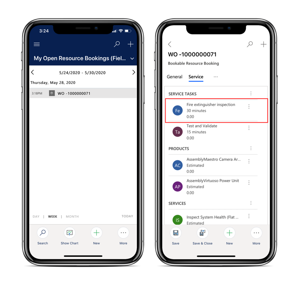 Technicians can view and complete inspections on the Field Service mobile app. To start an inspection, the technician can select the Work Order Service Task that has the related inspection.