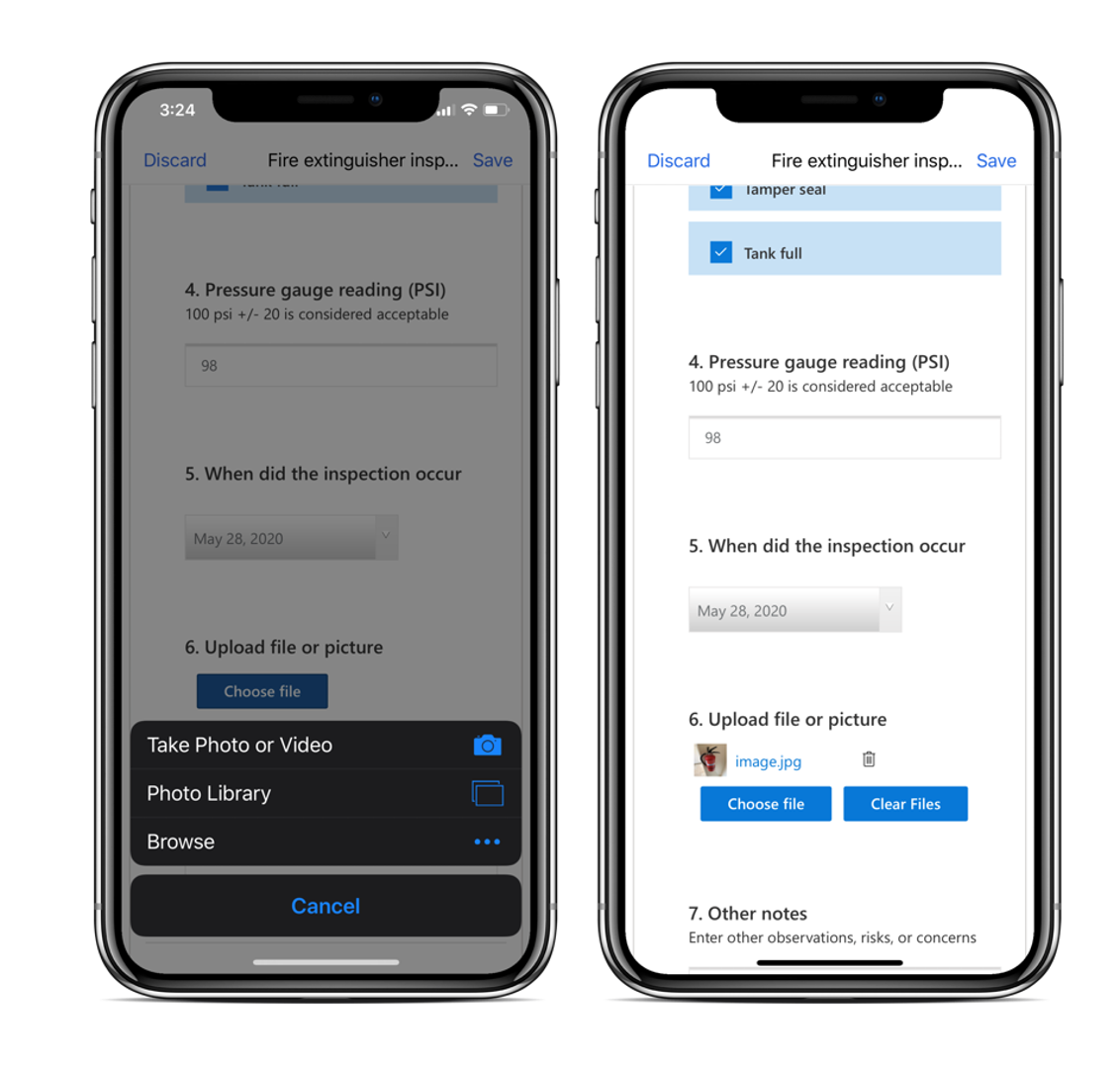 While a technician is performing work, they can select the Work Order Service Task that has the related inspection. As they complete the inspection, they can upload files, take pictures, or upload pictures from the phone's camera roll. Furthermore, the technician can add comments while uploading a file or images.