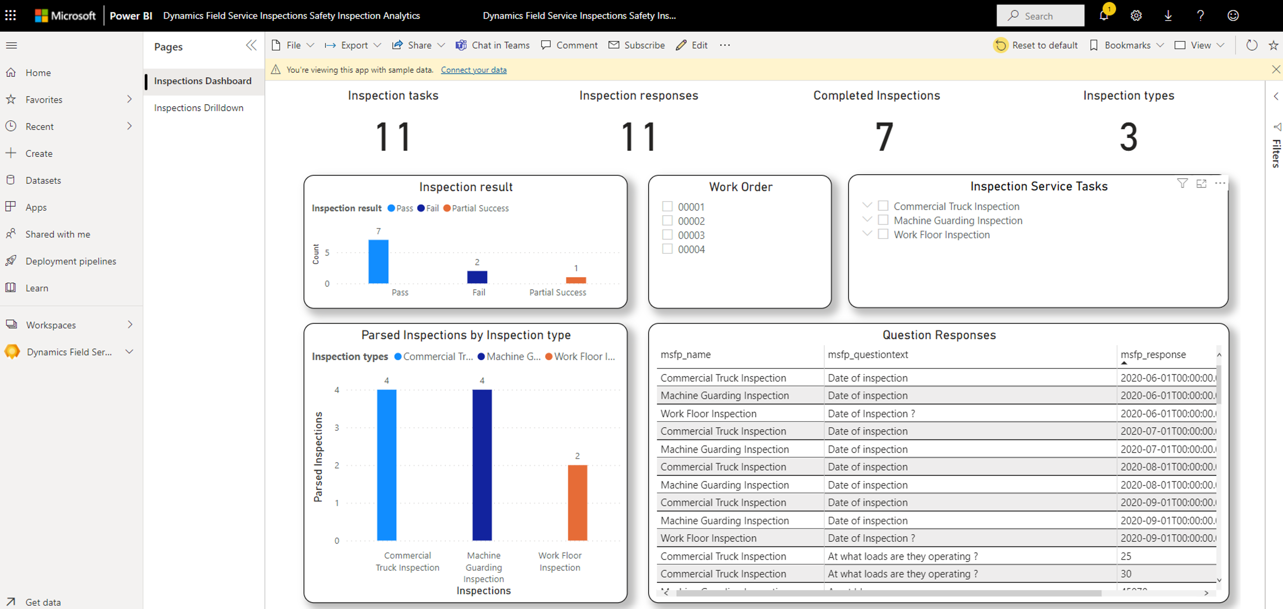 No out-of-the-box reports or dashboards are provided, and you need to create your own visualizations. We recommend that you use Microsoft Power BI. The following screenshot shows an example of a Power BI dashboard for inspections.
