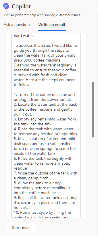 After you have provided details about the type of email you want to create, Copilot will generate a draft of the email. In the image below, copilot used a Knowledge Article to provide detailed instructions on how to resolve the customer's issue.