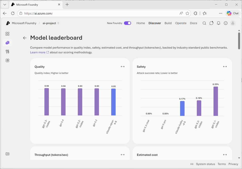 Met het leaderboard van het model kunt u de belangrijkste modellen voor specifieke metrische gegevens bekijken. U kunt sorteren op kwaliteit, veiligheid, geschatte kosten en doorvoer om modellen te identificeren die het beste aan uw vereisten voldoen.