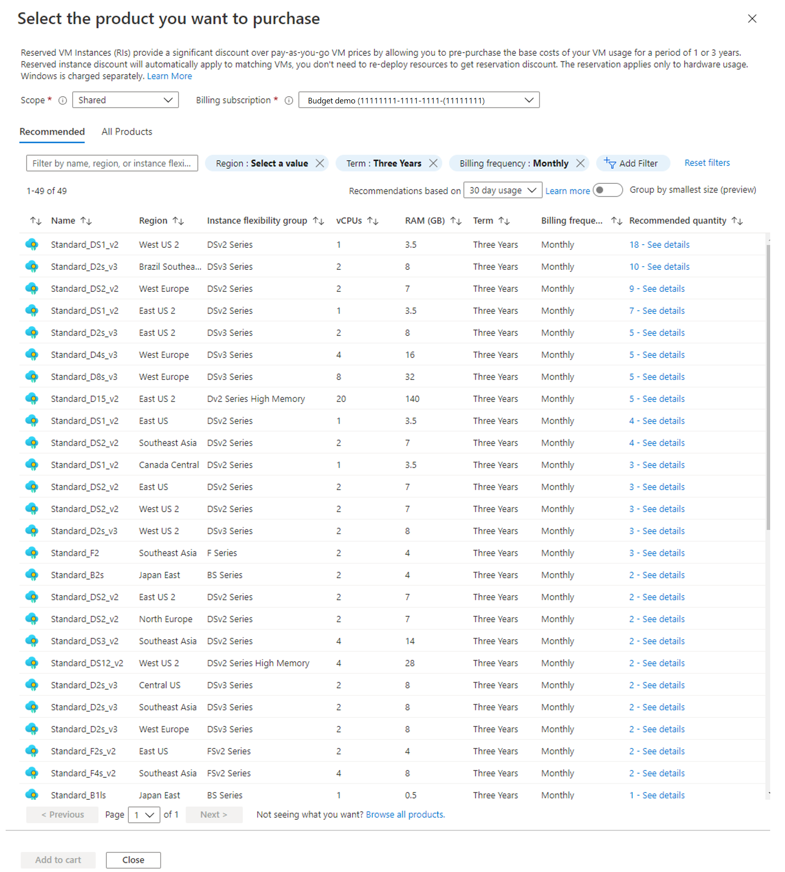 Selecteer het product waarvoor u reserveringen wilt kopen. Het venster Selecteer het product dat u wilt kopen wordt weergegeven. Azure raadt producten en hoeveelheden aan die uw besparingen maximaliseren.