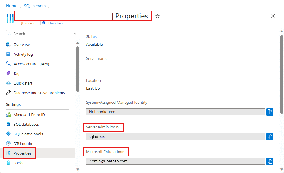 Aby zidentyfikować konto administratora serwera, otwórz witrynę Azure Portal i przejdź do karty Właściwości serwera logicznego lub wystąpienia zarządzanego: