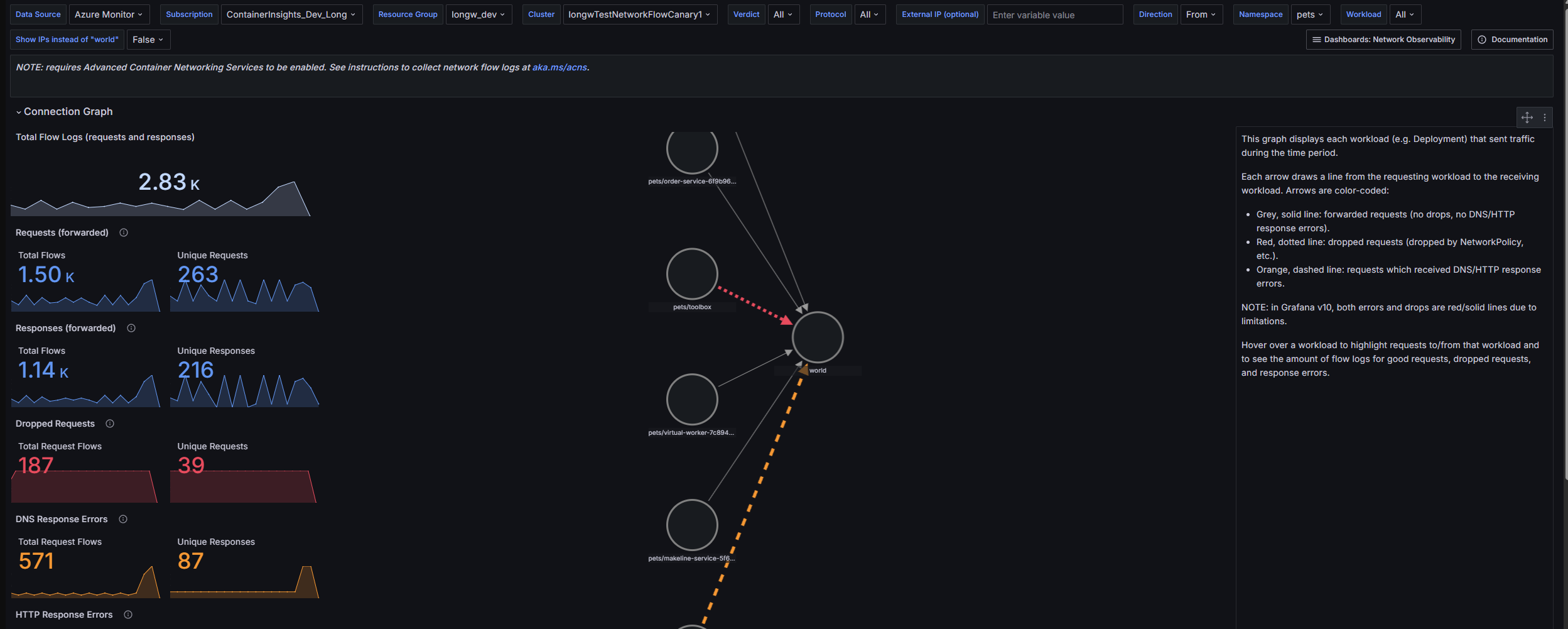 Najważniejsze przestrzenie nazw, obciążenia i błędy DNS. Wizualizacja dziennika przepływu sieci jest niezbędna do monitorowania i analizowania komunikacji w klastrze usługi AKS. Zapewnia wgląd w przestrzenie nazw, obciążenia, użycie portów i użycie zapytań. Pomaga identyfikować trendy, wykrywać wąskie gardła i diagnozować problemy. Wykryj znaczną aktywność sieciową, wyświetl porzucone żądania i oceń dystrybucję protokołów (na przykład TCP i UDP). Ta sekcja przeglądu pulpitu nawigacyjnego obsługuje kondycję klastra, optymalizację zasobów i zabezpieczenia przez wykrywanie i wyświetlanie nietypowych wzorców ruchu.