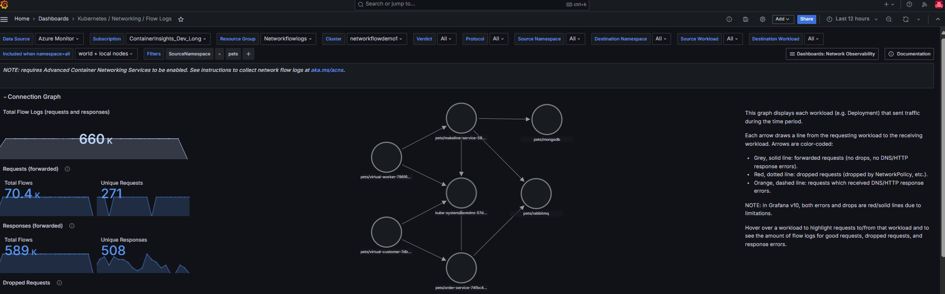 Przejdź do Azure>Insights>Kontenery>Sieć>Dzienniki przepływu. Ten panel sterowania pokazuje, które workloady AKS komunikują się ze sobą, w tym żądania sieciowe, odpowiedzi, spadki i błędy. Obecnie jako tymczasowy krok w wersji zapoznawczej należy zaimportować pulpity nawigacyjne Grafana przy użyciu identyfikatora użytkownika, aby wyświetlić pulpit nawigacyjny dzienników przepływu w portalu Azure.
