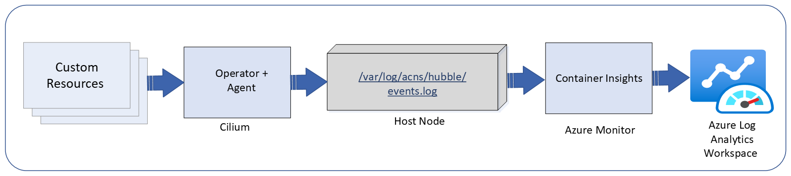 Alternatywnie, jeśli dodatek monitorowania platformy Azure jest włączony, agenci usługi Container Insights zbierają dzienniki z hosta, stosują domyślne limity ograniczania i wysyłają je do obszaru roboczego usługi Log Analytics. System agreguje i przechowuje dzienniki wydajnie, aby zapewnić wgląd w ruch sieciowy na potrzeby monitorowania, rozwiązywania problemów i wymuszania zabezpieczeń.