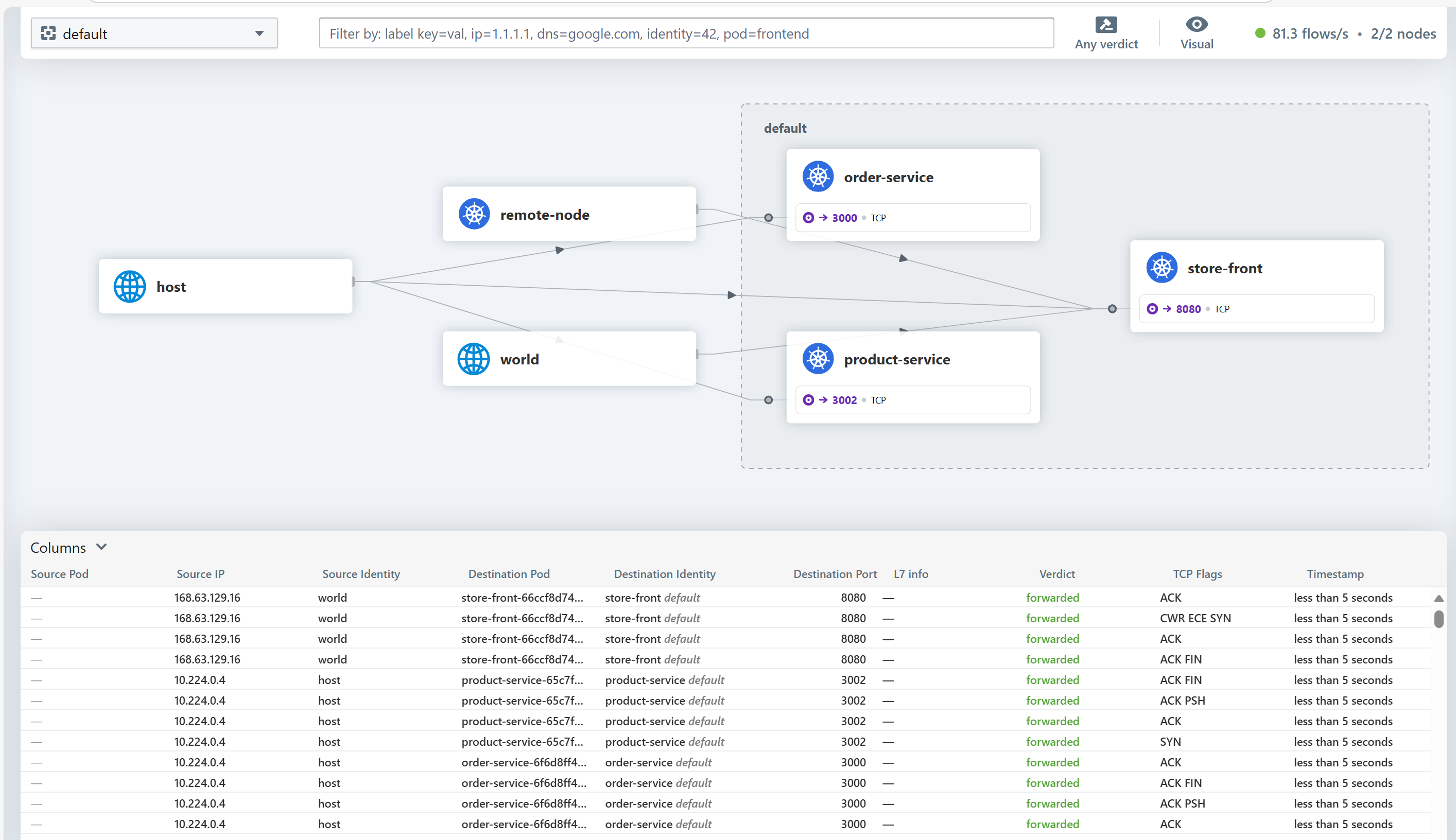 Te logi przechwytują podstawowe metadane dla każdego przepływu sieci, w tym źródłowe i docelowe adresy IP, nazwy podów i usług, przestrzenie nazw, porty, protokoły, kierunek ruchu i rozstrzygnięcia polityki. Te szczegółowe informacje kontekstowe umożliwiają skorelowanie zachowania sieci z określonymi obciążeniami, rozwiązywanie problemów z łącznością, weryfikowanie zasad zabezpieczeń i przeprowadzanie analizy śledczej.