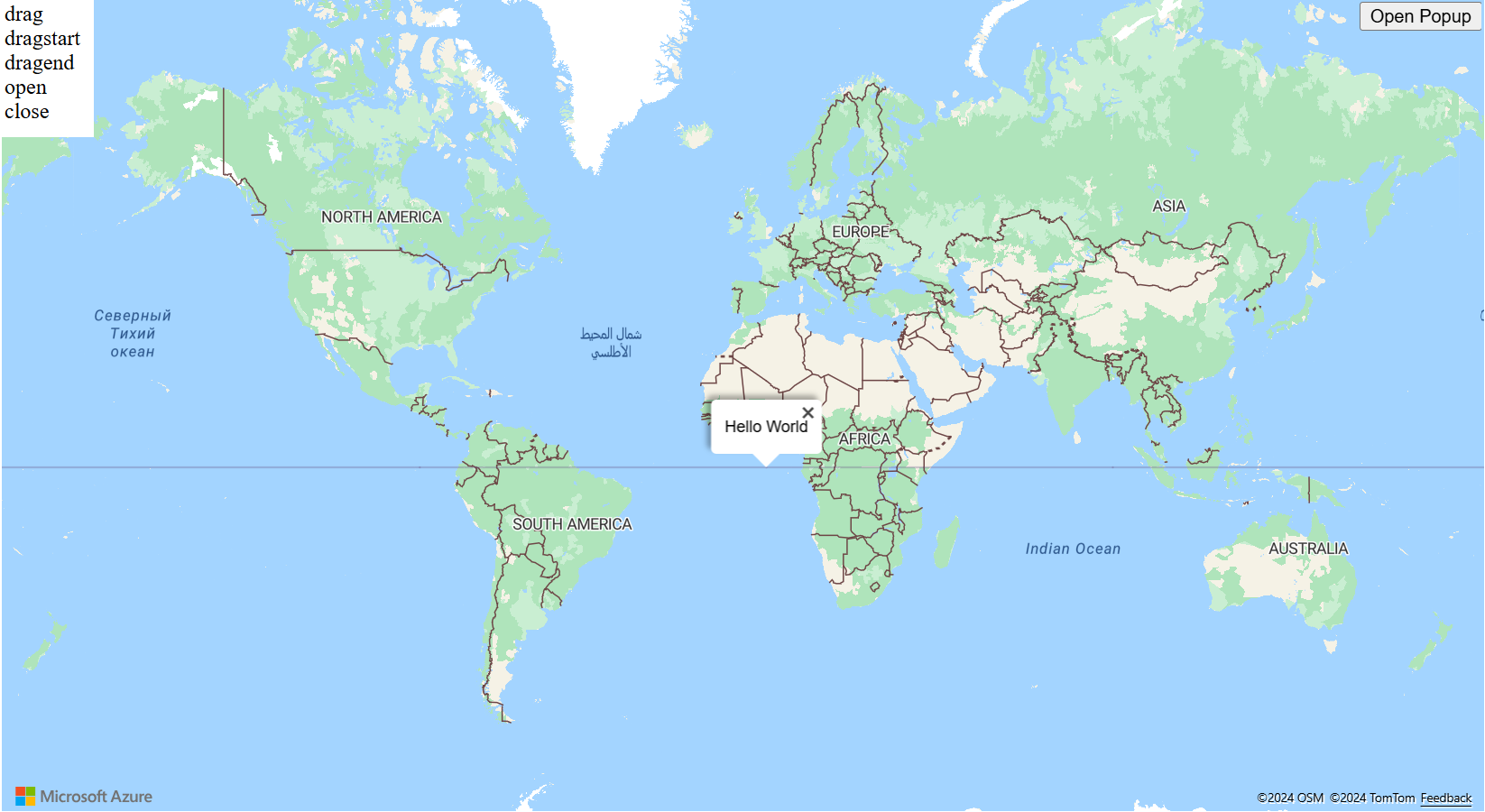 Aby zapoznać się z w pełni funkcjonalnym przykładem dodawania zdarzeń do wyskakujących okienek, zobacz Wyskakujące zdarzenia w przykładach usługi Azure Maps. Aby uzyskać kod źródłowy dla tego przykładu, zobacz Kod źródłowy zdarzeń wyskakujących.