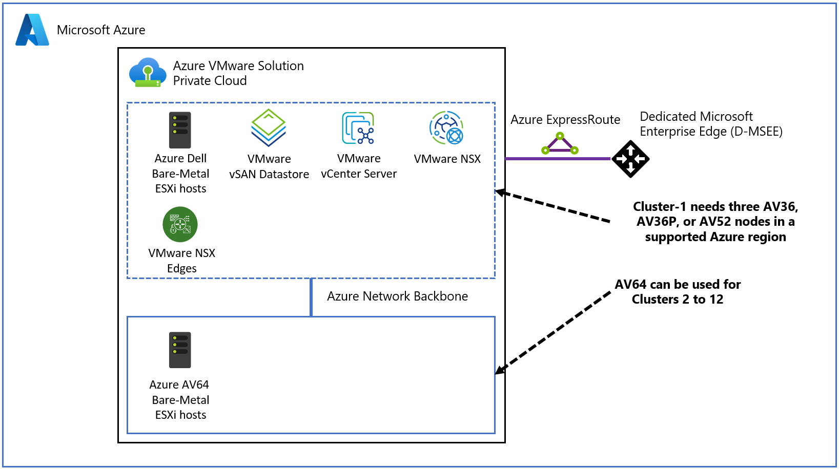 Azure VMware Solution Generation 1 udostępnia klastry VMware vSphere utworzone na podstawie dedykowanych serwerów bare-metal wdrożonych w centrach danych Azure. Zarządzane przez firmę Microsoft ExpressRoute obwody zapewniają łączność między hostami VMware vSphere i natywnymi zasobami Azure wdrożonych w sieciach wirtualnych.
