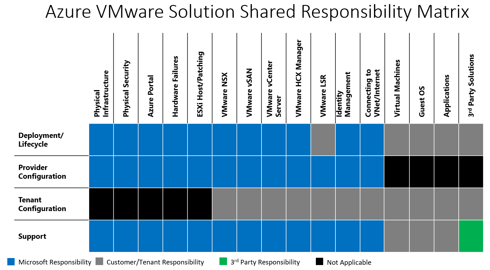 Azure VMware Solution implementuje model wspólnej odpowiedzialności, który definiuje odrębne role i obowiązki obu stron zaangażowanych w ofertę: klienta i firmę Microsoft. Obowiązki wspólnej roli przedstawiono bardziej szczegółowo w poniższych dwóch tabelach.