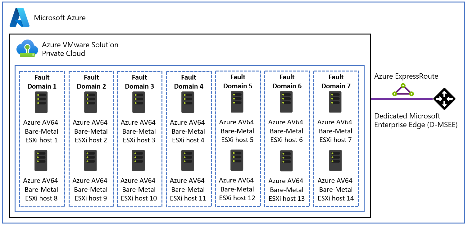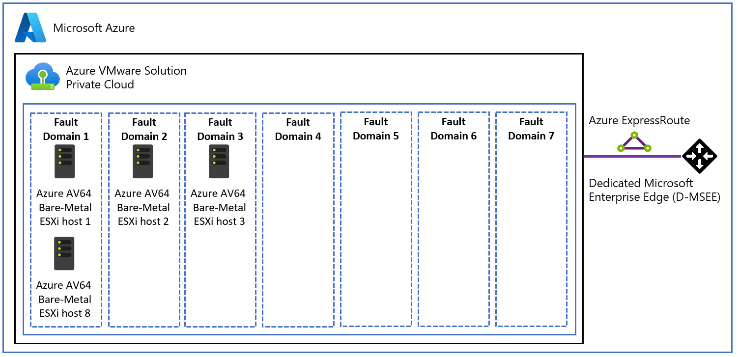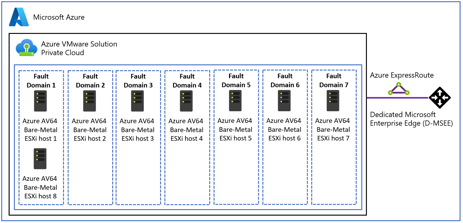 Klastry hostów Azure VMware Solution AV64 mają jawną konfigurację domeny błędów vSAN (FD). Azure VMware Solution płaszczyzna sterowania konfiguruje siedem domen błędów vSAN (FD) dla klastrów AV64. Hosty są równomiernie rozłożone na siedem domen awarii, gdy użytkownicy zwiększają liczbę hostów w klastrze z trzech do szesnastu węzłów. Niektóre Azure regiony nadal obsługują maksymalnie pięć dysków FD w ramach początkowej wersji jednostki SKU AV64. Aby uzyskać więcej informacji, zobacz tabelę mapowania stref dostępności regionów Azure na typy hostów.
