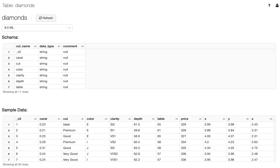 Aby wyświetlić podgląd tabeli, zapytanie Spark SQL jest uruchamiane w klastrze wybranym na liście rozwijanej Cluster. Jeśli klaster ma już uruchomione obciążenie, ładowanie podglądu tabeli może potrwać dłużej.