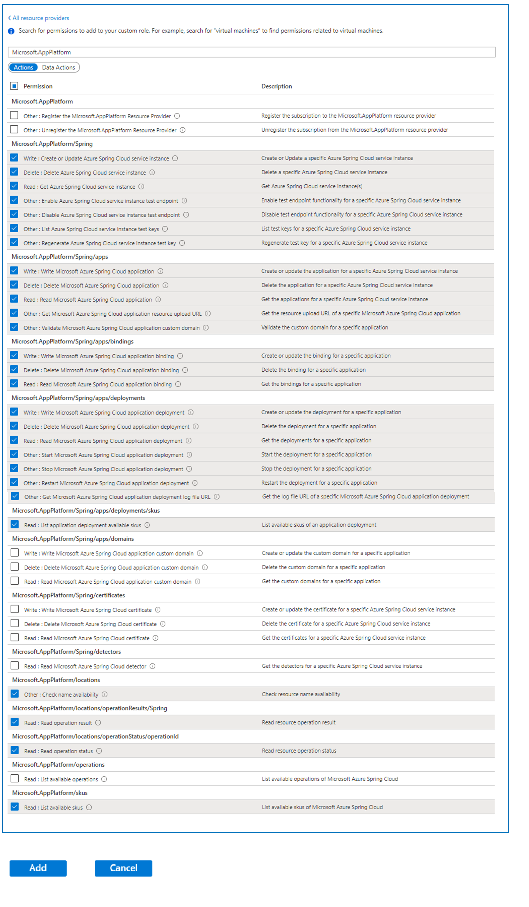 W obszarze Microsoft.AppPlatform/locations wybierz pozycję:
