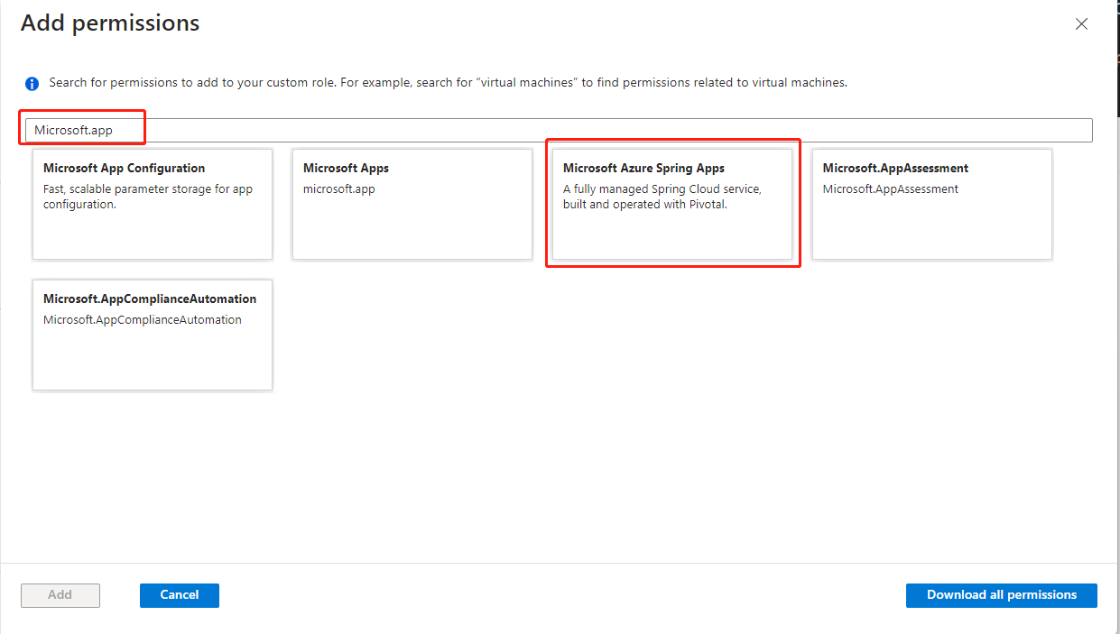 W obszarze Microsoft.AppPlatform/locations/operationResults/Spring wybierz pozycję: