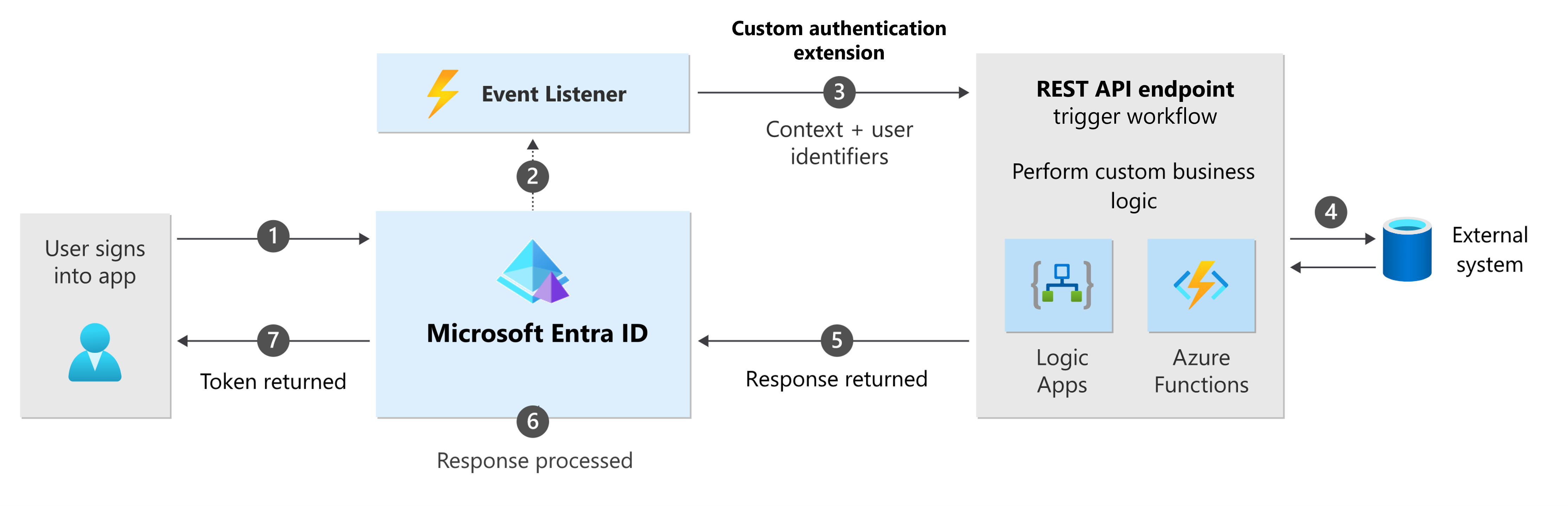 Niestandardowe rozszerzenia uwierzytelniania firmy Microsoft umożliwiają rozszerzanie przepływów uwierzytelniania przy użyciu własnej logiki biznesowej w określonych punktach przepływu uwierzytelniania. Niestandardowe rozszerzenie uwierzytelniania jest zasadniczo odbiornikiem zdarzeń, który po aktywowaniu wykonuje wywołanie HTTP do punktu końcowego interfejsu API REST, w którym definiuje się akcję przepływu pracy.