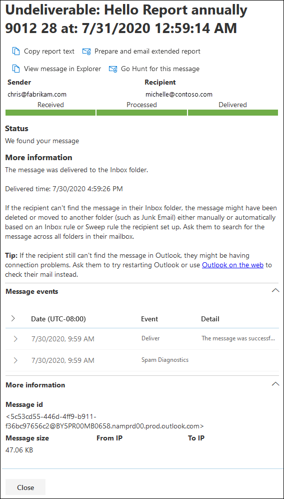 2bbad36aa4674c7ba82f4b307fff549. - The results of the Get-MessageTraceV2 command are piped to the Get-MessageTraceDetailV2 cmdlet. The results allow you to identify: