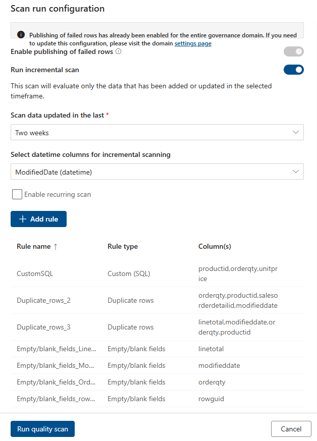 Microsoft Purview Data Quality supports incremental data quality scans by using time-based filtering. By using incremental scans, you can choose between full scans, incremental scans, or both when you run data quality rules on data assets.