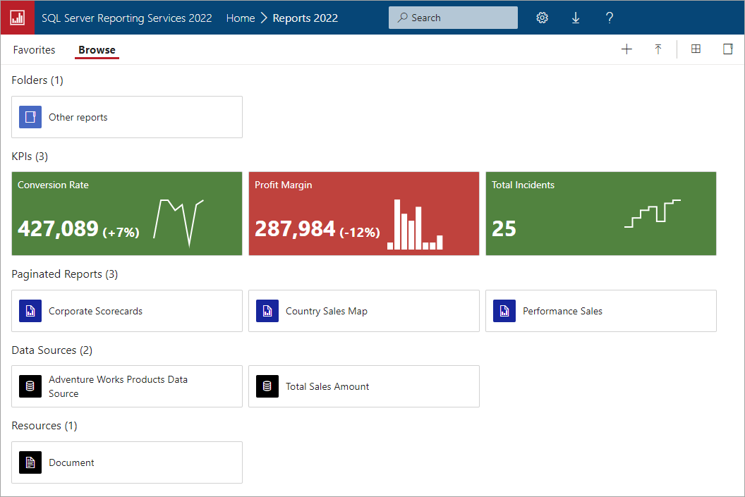 Portal internetowy serwera raportów usług SQL Server Reporting Services (SSRS) umożliwia wyświetlanie raportów, kluczowych wskaźników wydajności (KPI) i nawigowanie po elementach w wystąpieniu serwera raportów. Można również administrować pojedynczym wystąpieniem serwera raportów za pomocą portalu internetowego.