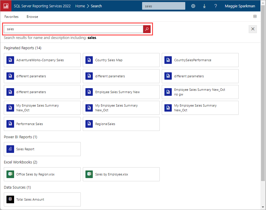 - Przeglądaj foldery serwera raportów lub wyszukaj określone raporty.