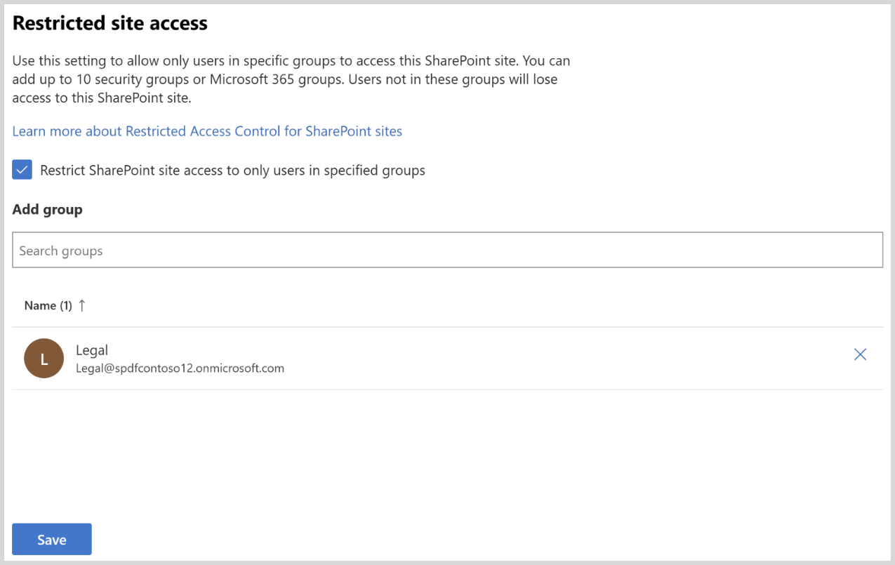 For a group connected site, the Microsoft 365 group connected to the site is added as the default Restricted Access Control group. You can choose to keep this group and add more Microsoft 365 or Microsoft Entra Security groups as Restricted Access Control group.