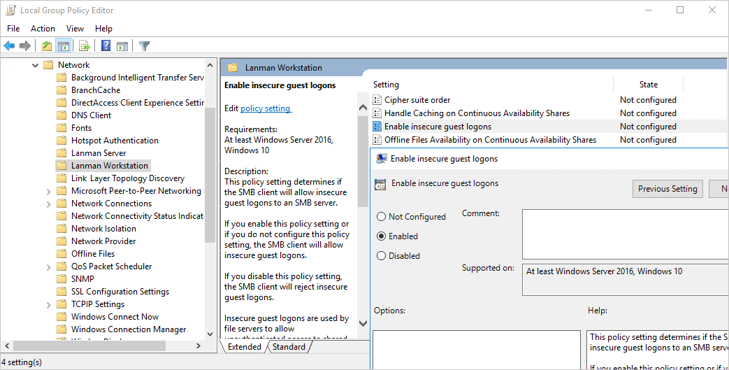 Na podstawie podanych informacji zalecam użycie Edytora lokalnych zasad grupy, aby włączyć niezabezpieczone logowanie gościa. Zapoznaj się z następującymi krokami:
