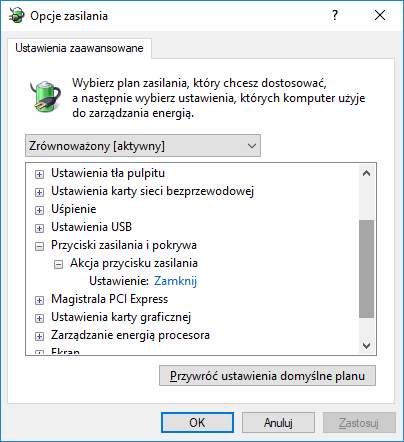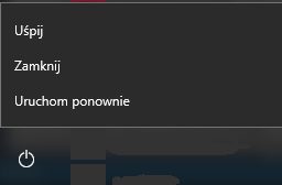 Sprawdź proszę czy w Opcjach zasilania > Zmień zaawansowane ustawienia planu > Przyciski zasilania i pokrywa > Akcja przycisku zasilania jest ustawiona funkcja Zamknij a nie Uśpij.