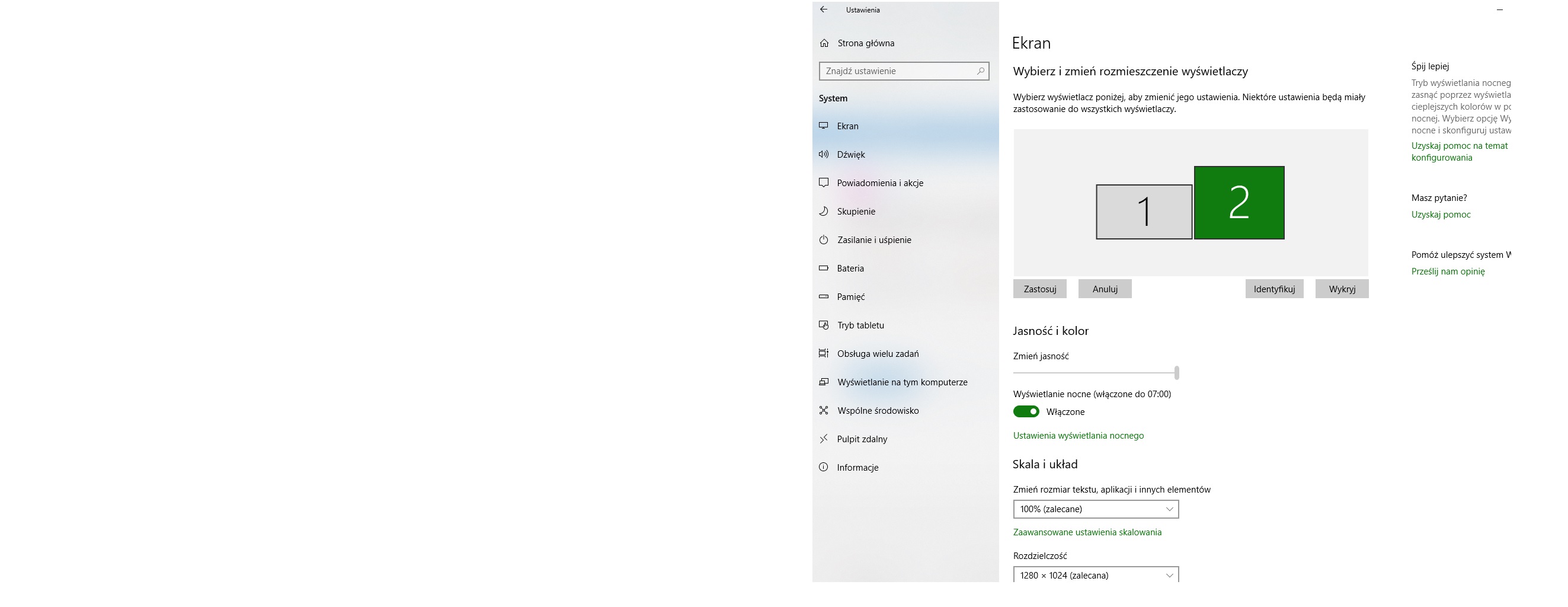 Ja mam lapka i do niego podłączony jest zewnętrzny monitor, który jest głównym wyświetlaczem. Tak jak na zrzucie ekranu, wyświetlacz laptopa ma nr 1. Zewnętrzny monitor ma nr 2 i on jest ustawiony jako główny. Jest to trochę nieintuicyjne lecz da się z tym żyć.