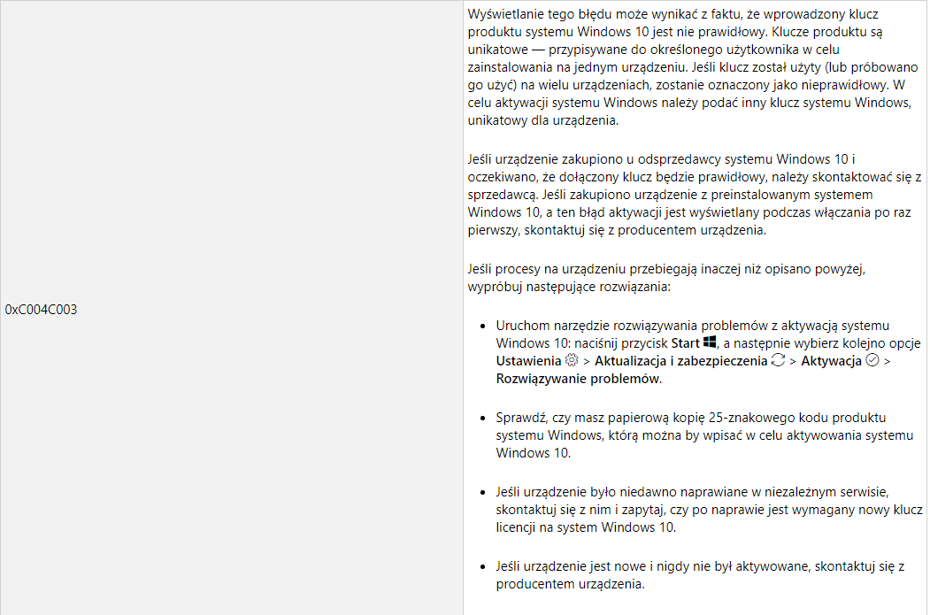 Więcej informacji na temat kodów błędów pojawiających się podczas aktywacji znajdziesz w artykule Uzyskiwanie pomocy dotyczącej błędów aktywacji systemu Windows.