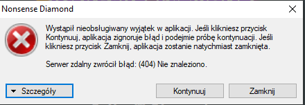 Wystąpił nieobsługiwany wyjątek w aplikacji. Jeśli klikniesz przycisk Kontynuuj, aplikacja zignoruje błąd i podejmie próbę kontynuacji.