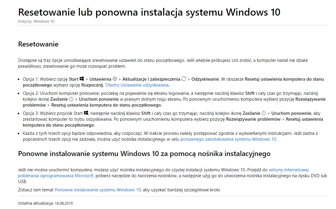 - Reset systemu wg tej instrukcji https://support.microsoft.com/pl-pl/help/4026528/windows-10-reset-or-reinstall. Przypominam o zabezpieczeniu potrzebnych danych najlepiej na zewnętrznym dysku pamięci. Tu bardzo pomocna będzie informacja https://support.microsoft.com/pl-pl/help/12415/windows-10-recovery-options, rozdział "Resetowanie komputera". Ponieważ są różne możliwości resetowania, proszę wybrać najbardziej odpowiednią w swoim przypadku.