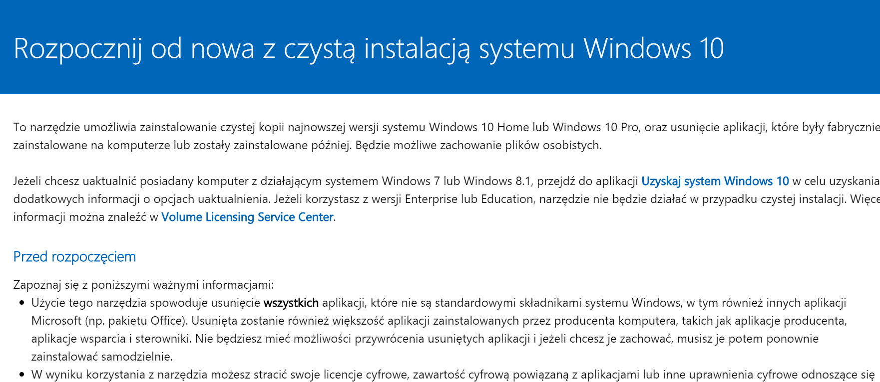 - Jeżeli reset nie pomoże, trzeba będzie zapisać wszystkie potrzebne dane najlepiej na dysku zewnętrznym i wykonać czystą instalację wg instrukcji: https://www.microsoft.com/pl-pl/software-download/windows10startfresh.