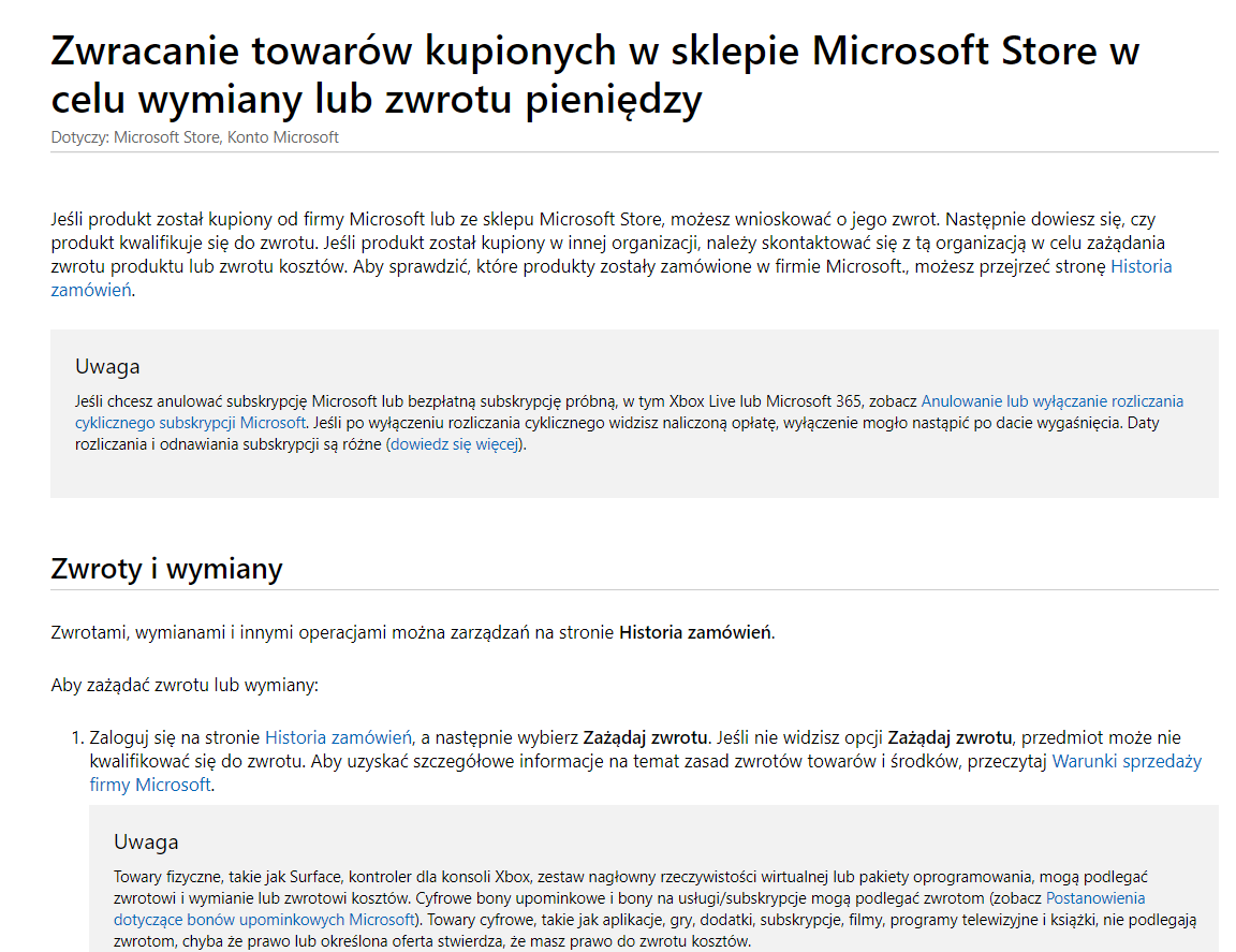 "Zwracanie towarów kupionych w Microsoft Store z opcją wymiany lub zwrotu pieniędzy".