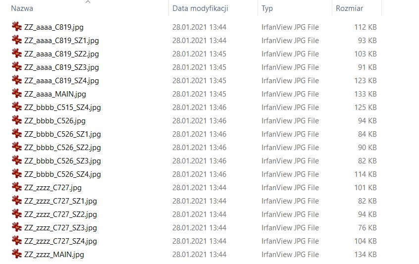 Z poniższego zbioru (w którym są tylko zdjęcia w formacie .jpg), chcę wykluczyć/wyszukać tylko nazwy plików, które nie mają w nazwie "SZ". Będę wykonywał tą operację setki razy, na dziesiątkach tysięcy plików - najczęściej w formatach: .jpg, .png, .xls, .xlsx (zakładam na poniższym przykładzie, że folderze wyszukiwanym znajdują się pliki tylko jednego formatu, ale dobrze było by również znaleźć odpowiedź na pytanie o kilka formatów np. .jpg i .png w jednym folderze.).